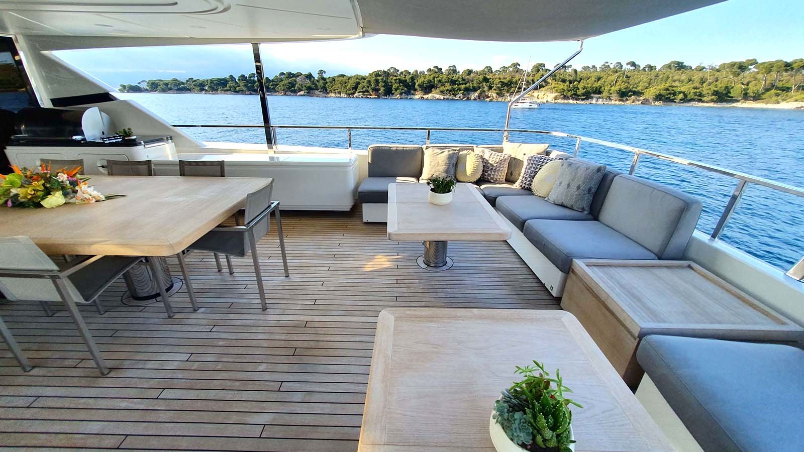 The yacht exterior spaces comprise of 4 vast areas over three levels. On the main deck adjacent to the salon is a shaded seating area.