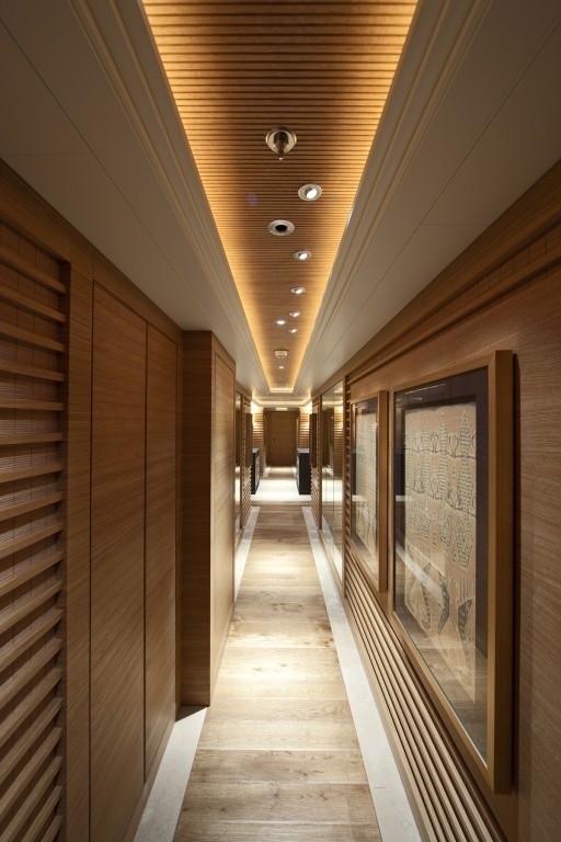The main deck houses five guest staterooms, including the VIP suite with an Emperor bed and four double or twin King size convertible suites. A central spiralling staircase connects all deck areas, while an elevator also connects to the master deck from the sun deck below.