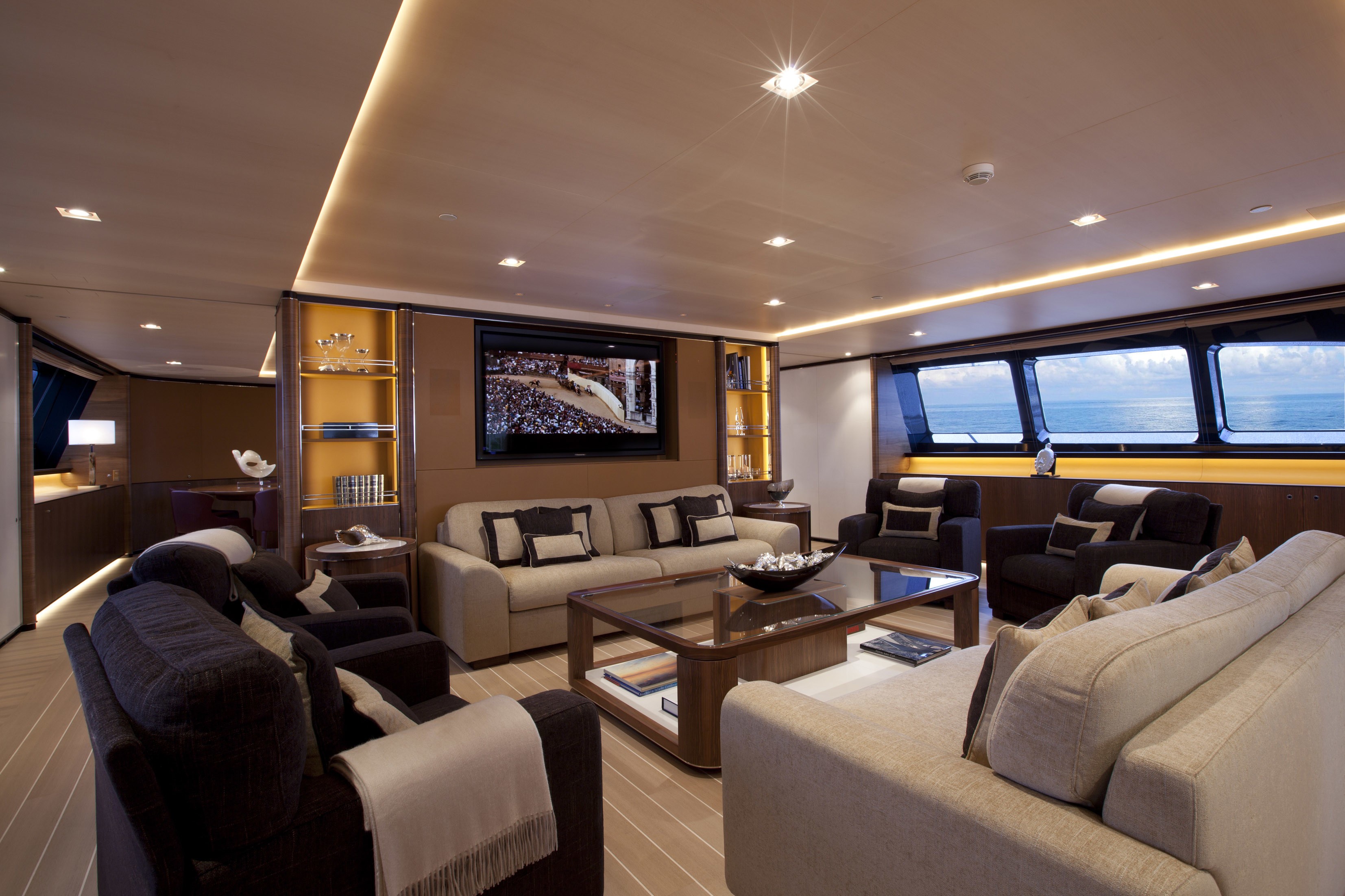 The main saloon, designed as a light-filled open space, is divided into two areas by an unusual central element that houses both the steel and wenge staircase that leads to the lower deck and two elegant sliding glass doors that ...