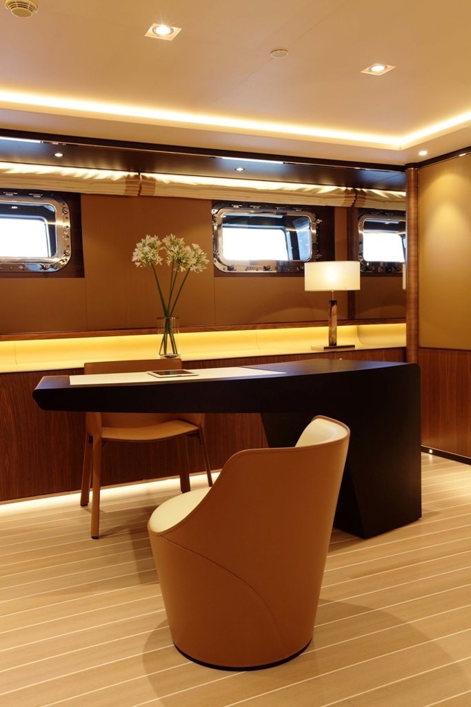 This bridge area has been completely re-modeled compared to her sister ships in that it has a wide sunning and lounging area aft with two central seats from which to enjoy the view, a dining area and the steering stations with ...