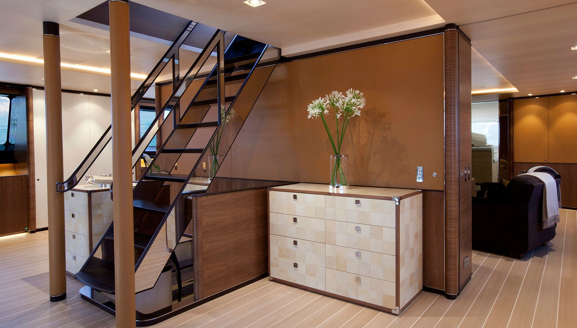 The aft cockpit has a well-protected dining area with a table for twelve and a lounging area with three couches, two armchairs and a coffee table.