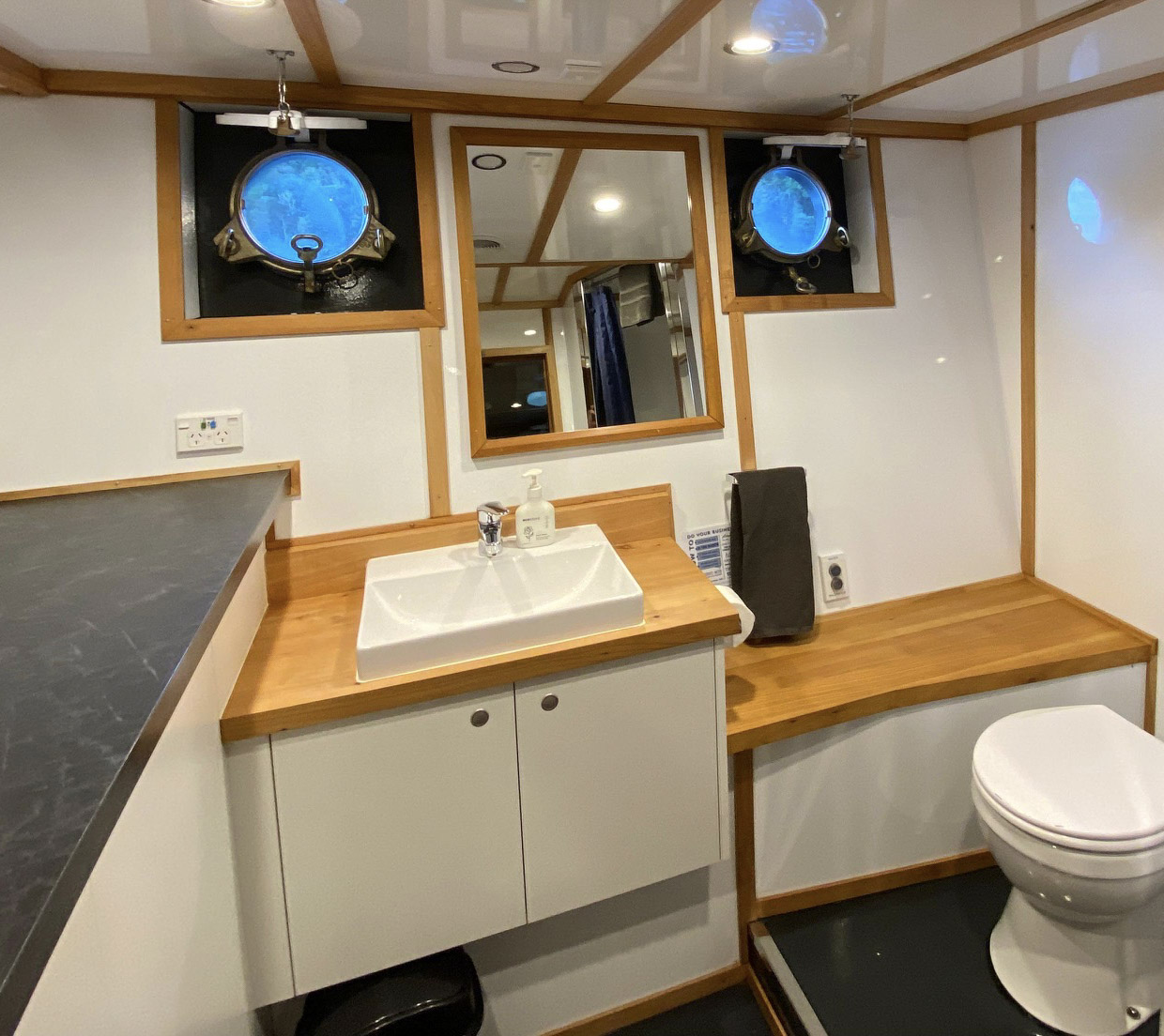 The exterior aft deck is enclosed and sheltered with an alloy awning and clear curtain sides. It is possible to enjoy el fresco meals here on the large hardwood dining table with 6 cushioned chairs and two 6 seat picnic tables. On the upper sun deck, there is a 6 seater picnic table and 2 cushioned sun loungers.