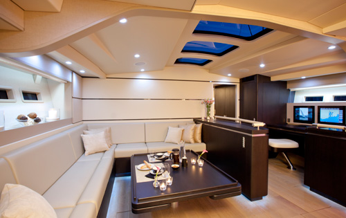 The saloon is spacious with an open plan layout, and a rise-and-fall table that can convert a formal dining area into a relaxed place to enjoy the state of the art multimedia systems in an informal surrounding. The large and fully appointed galley allows the chef to create fabulous offerings with ease.