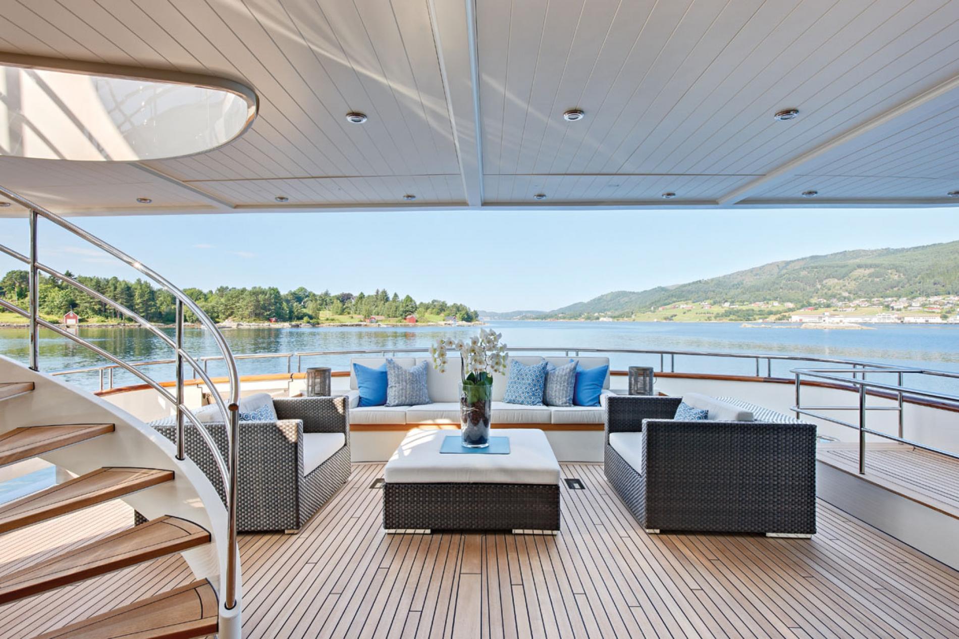One of her main features is the offset spiral staircase dynamically connecting the three decks. Panoramic views up through the sweeping underside of the steps make this a striking centrepiece to the yacht.