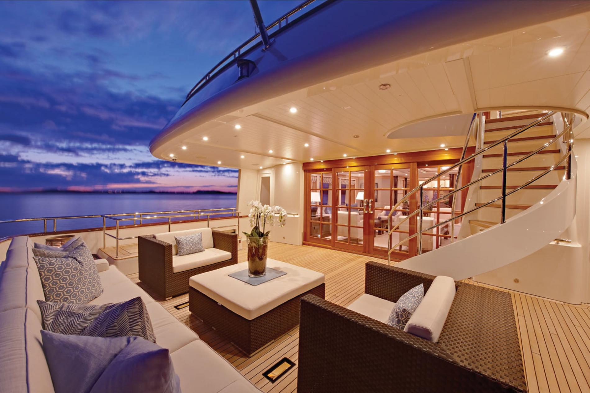 The entire aft deck and saloon blend into one inside-out cone, thanks to the large sliding doors that open to the aft deck. This area is ideal for informal leisure at anchor.