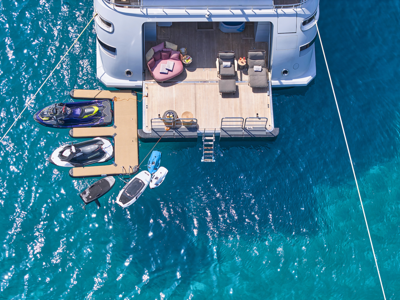 Two stairways lead to the lower deck swim platform below, where the fold-down swim platform connects to the beach club to create a partially-shaded lounge beside the water.