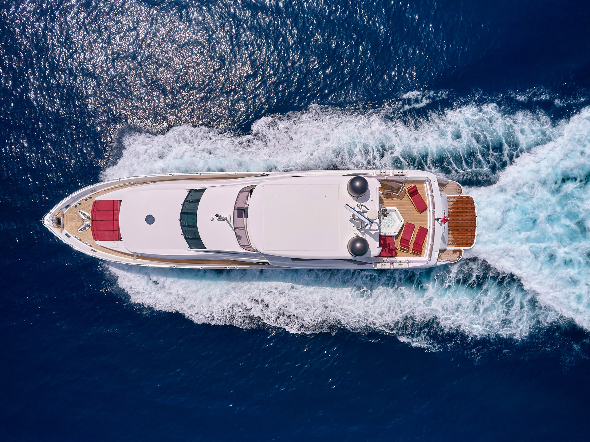 The aft interior hosts the formal dining area and main salon together. The formal dining area seats up to 10 guests in timeless surroundings before the sumptuous sofa and armchairs tempt guests to unwind after a meal with ...