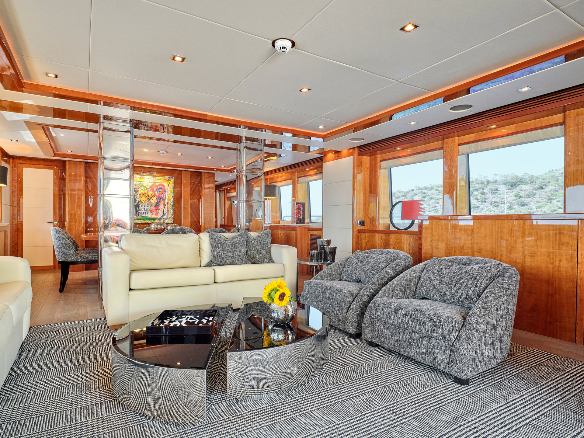 The aft interior hosts the formal dining area and main salon together. The formal dining area seats up to 10 guests in timeless surroundings before the sumptuous sofa and armchairs tempt guests to unwind after a meal with ...