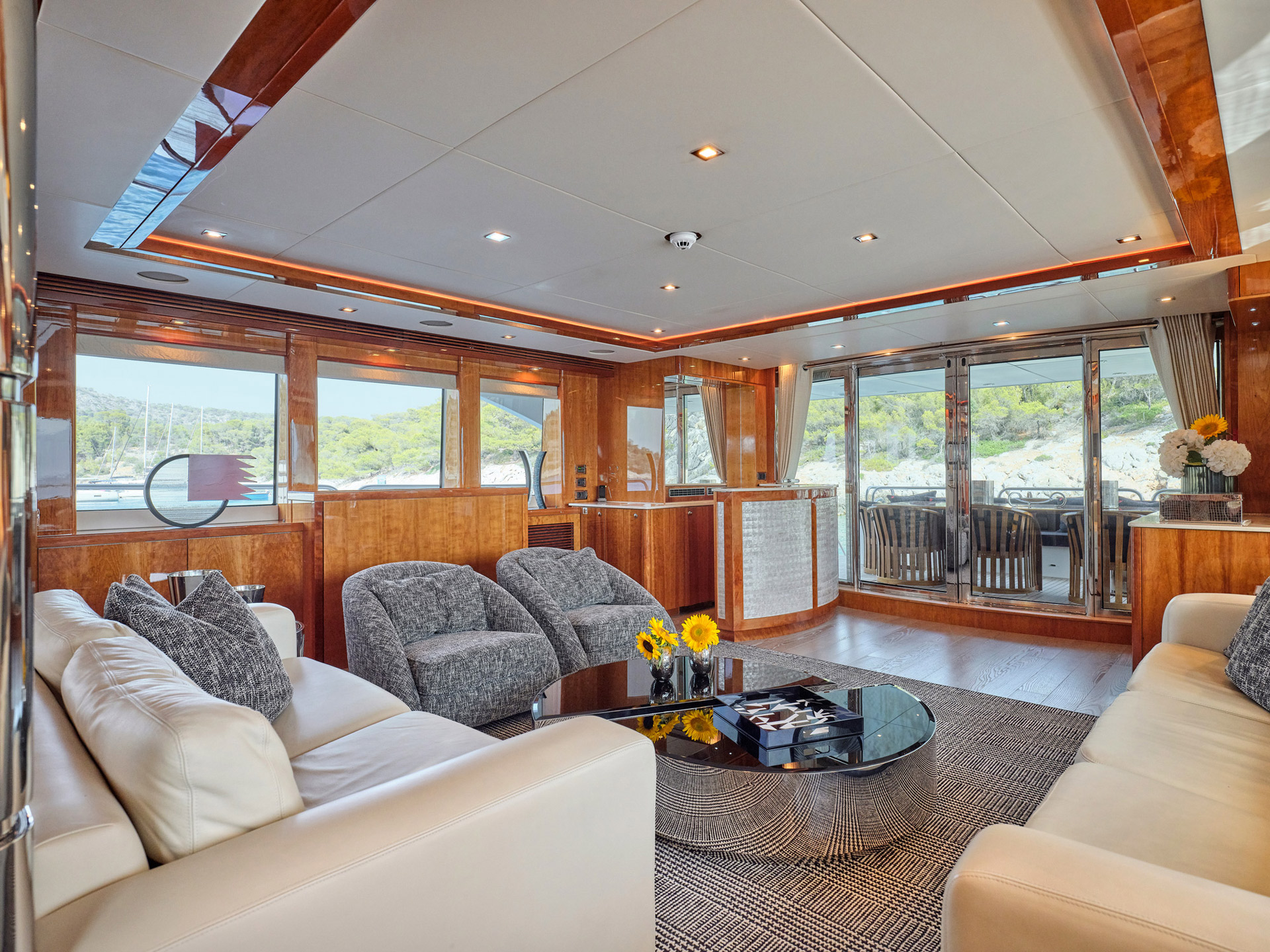 The aft interior hosts the formal dining area and main salon together. The formal dining area seats up to 10 guests in timeless surroundings before the sumptuous sofa and armchairs tempt guests to unwind after a meal with ...