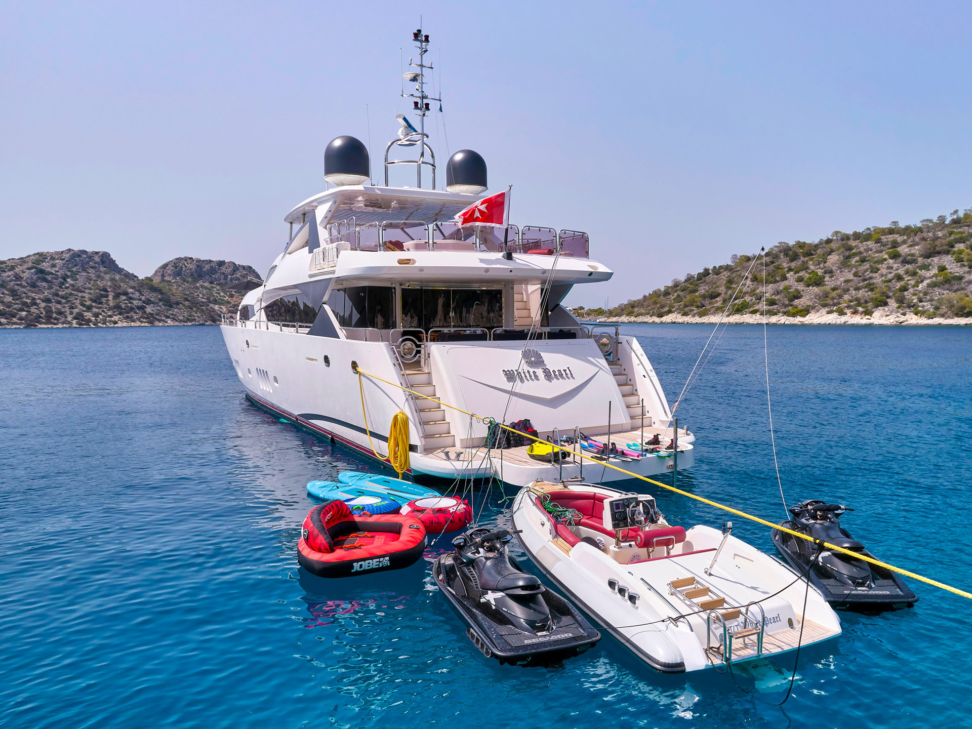 NOTABLE FEATURES OF WHITE PEARL I: ~Master and VIP suites with bathtub Jacuzzi ~Sundeck Jacuzzi, bar and TV ~Choice of sunbathing areas ~Timeless interiors ~Large selection of water toys ~Top speed of 25 knots ~Air conditioning ...