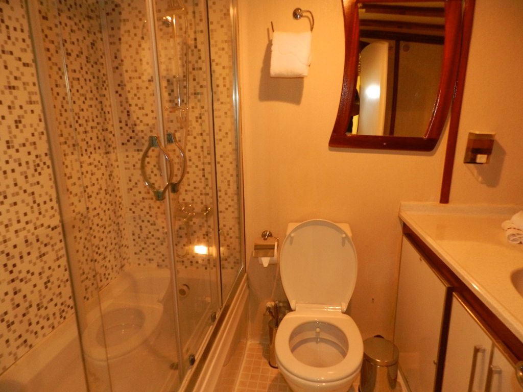 All cabins have private ensuite heads, hot water, individually controlled air conditioning, TV, VCR, music system and inbound telephone system. Separate crew cabins, impressive and fully furnished saloon with American bar, indoor/outdoor seating and dining facilities for 14 guests.