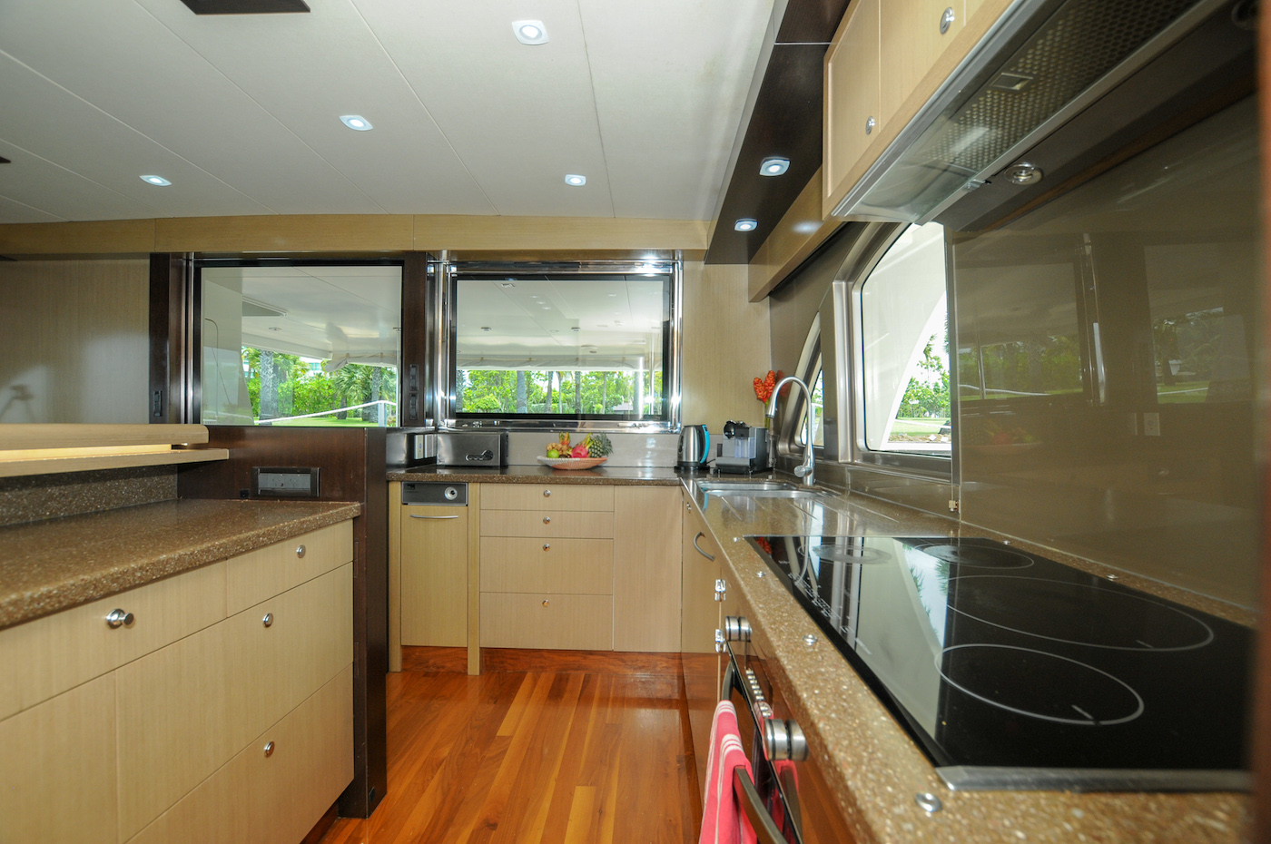 The main rear deck of motor yacht TEXAS T also accommodates 8 diners with a large fridge and a servery from the galley.
