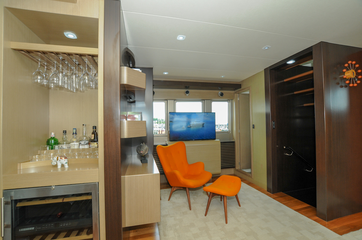 The entertainment centre includes a 50” digital LCD TV, boasting surround sound from quality Bose speakers with satellite programming, CD, DVD and ipod dock. There is also two way powder room entering from saloon and side deck.
