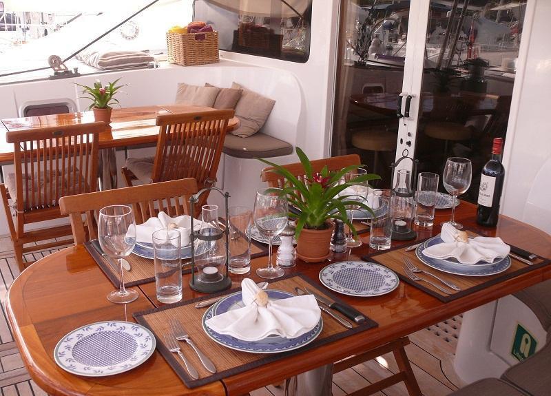 The pair of teak dining tables in the enormous cockpit provides the perfect base for al-fresco meals which are prepared and served by our professional yet charming crew.