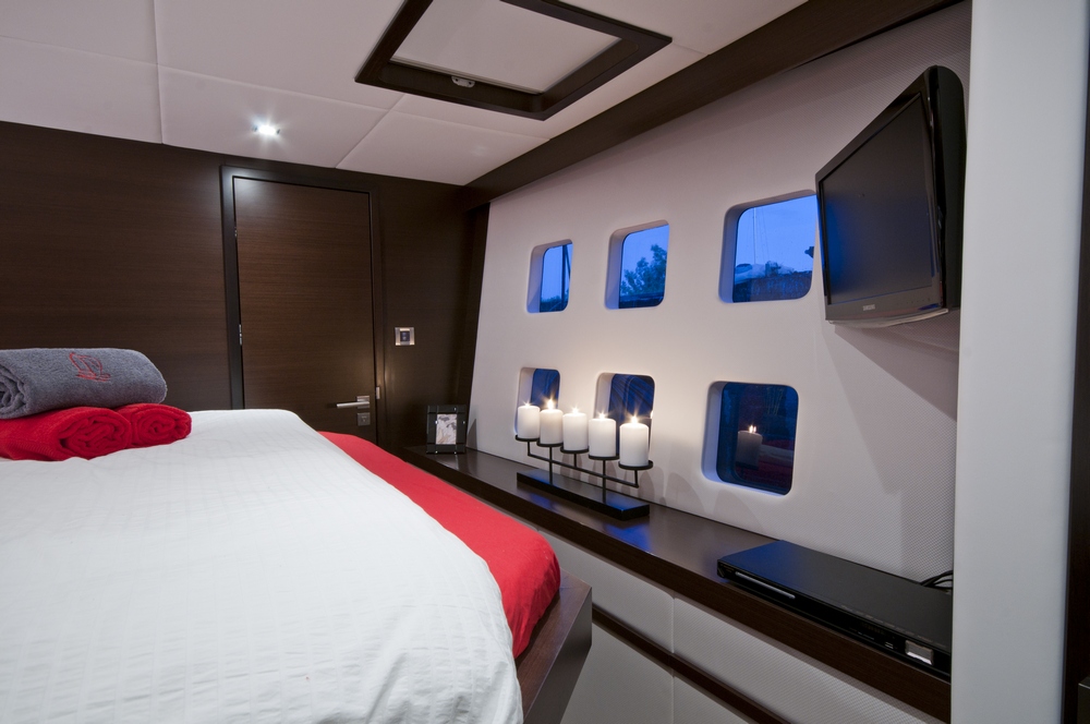 The yacht boasts a modern Japanese style interior design. Wenge wood adds a deep contrast to the light ceilings and floors, with soft red accents to enhance the elegant simplicity of this luxury charter catamaran.