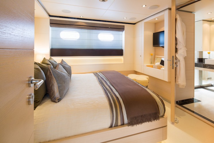 There are five cabins with interior design by Omega Architects. The full-beam master suite is situated on the main deck and includes a study and full-beam his-and-hers marble bathroom. Two double and two twin cabins, all with ensuite marble bathrooms, are located on the lower deck.