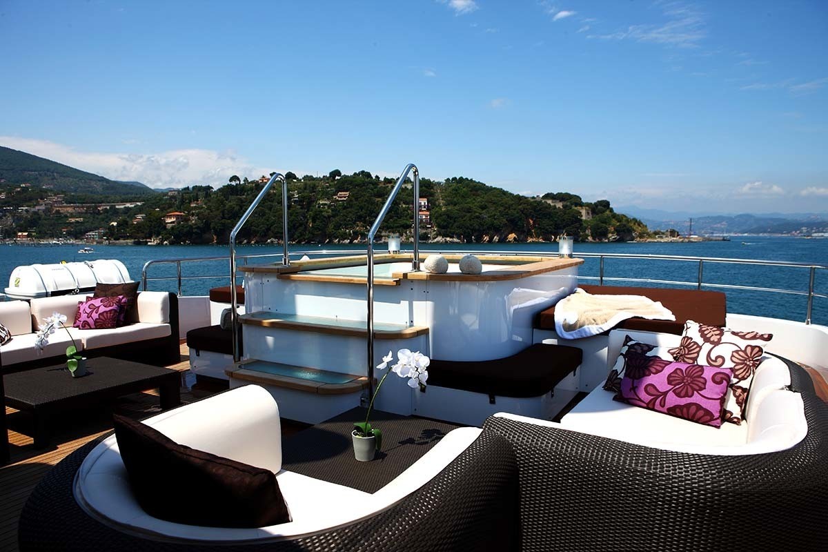 She offers superb accommodation to 12 guests in 6 comfortable Luca Dini designed cabins. Her layout comprises two full beam master staterooms of identical size. One of the master suites is located on the main deck forward, whereas the other can be found on the upper bridge deck. The latter features direct access to the exterior deck.