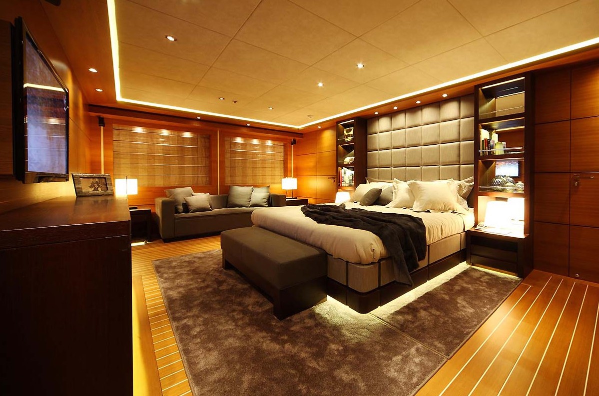 The master cabin is on the upper deck and boasts private access to the exterior deck; the cabin is full beam of the yacht with a king size bed and features an owner’s salon and office, en-suite facilities with a Spa Pool tub, steam bath and spa room.