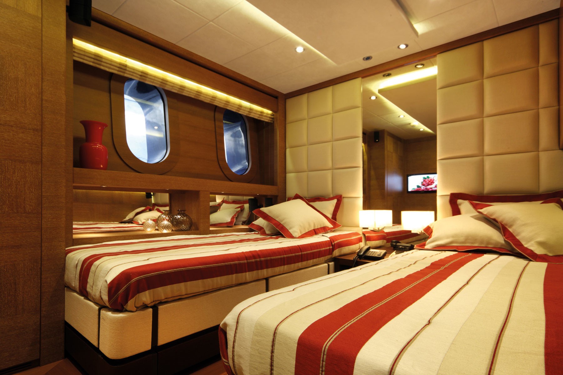 NOTABLE FEATURES for ZALIV III: Striking blue hull ~ Contemporary timeless interior decor ~ On deck master stateroom and VIP cabin ~ Spacious sundeck ~ Large swim platform ~ Vast array of water toys ~ Wifi