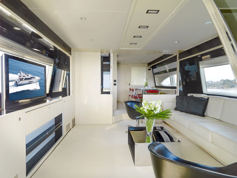 The Stingray M yachts salon located on the main deck is comfortable and bright, with a leather couch to starboard, and a large pop up TV screen to port. Further forward is a dining area that is easily served by the nearby Galley. All the way forward is another seating area in the bridge, where you can see all of the action taking place.