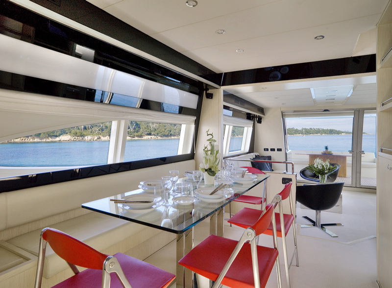 Further forward is a dining area that is easily served by the nearby Galley. All the way forward is another seating area in the bridge, where you can see all of the action taking place.