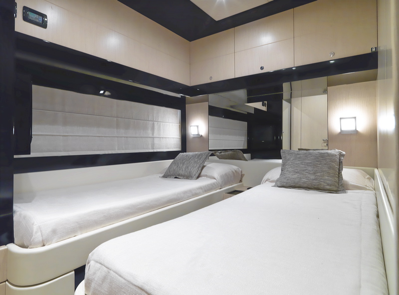 The STINGRAY M motor yacht is able to accommodate up to 6 guests in three beautifully appointed cabins with ensuite facilities located on the lower deck. The vast main cabin, spanning the width of the yacht has a study area, vanity unit with foldaway pouf, 30” LCD television and an elegant walk-in wardrobe.