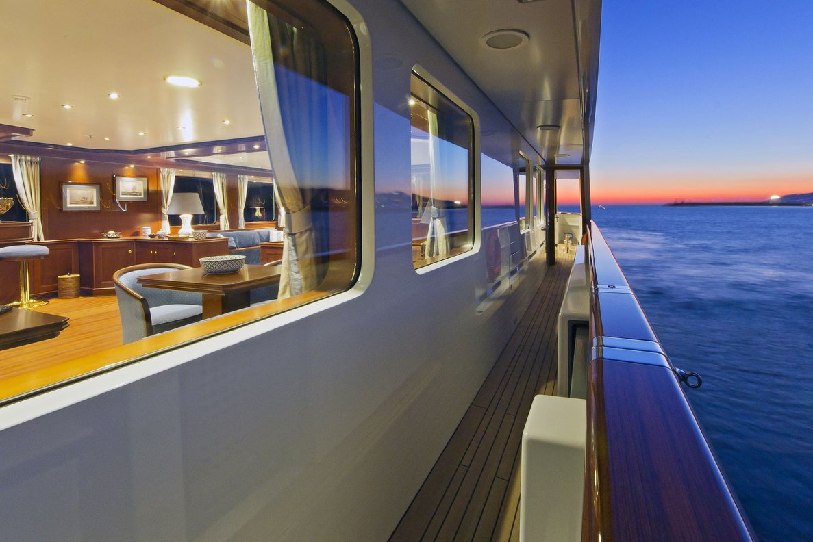 This area is equipped with a fully glazed semicircular door that opens fully to almost the entire width of the superstructure, thus linking the interior to the exterior space. The captain’s cabin and the wheelhouse too are located on this deck.
