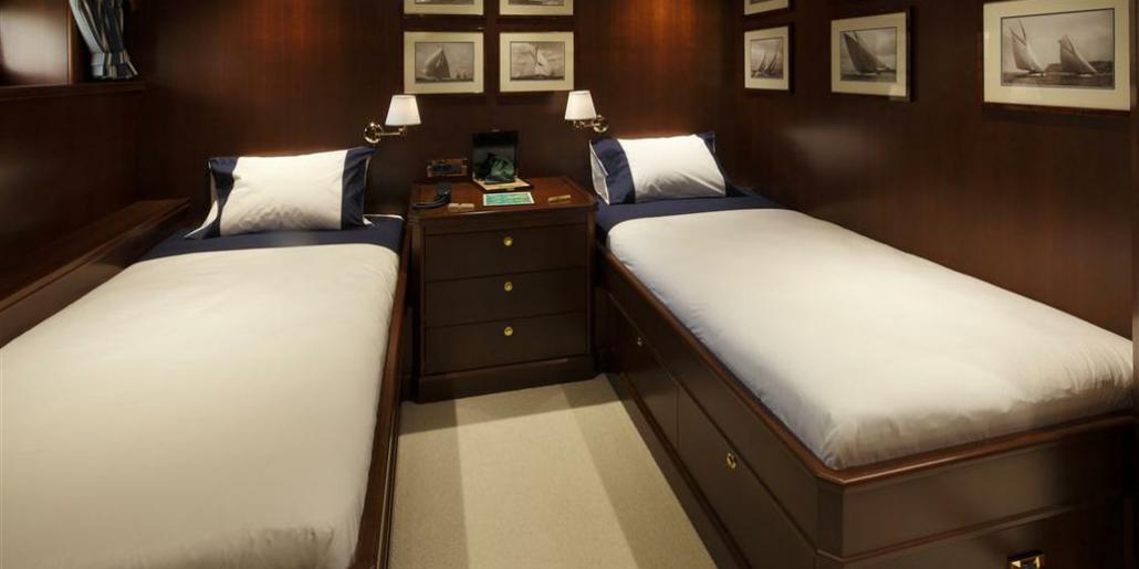 There are two twin cabins to starboard aft and port, each with a Queen bed and bathroom with toilet, shower and a wash basin. The Twin cabin is located starboard forward and offers side by side twin beds and a bathroom. The Double cabin situated to port, forward has a double bed and well as a Pullman bunk, and office desk and a bathroom.