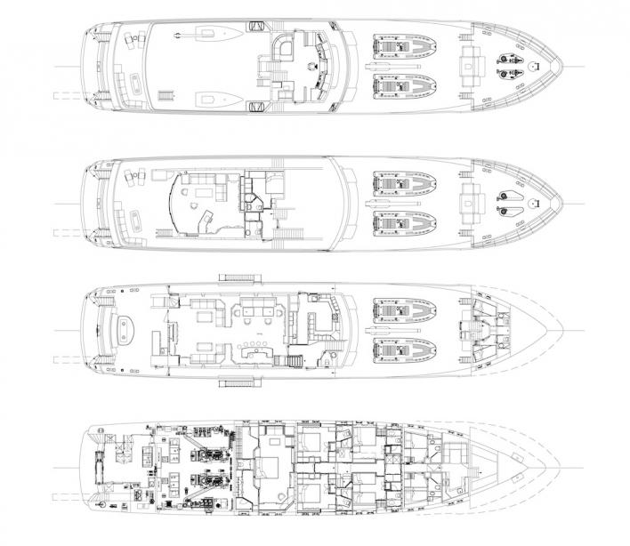 The interior layout was designed to offer guests the enjoyment of all outdoor aft areas, such as the lounges and access to the sea.
