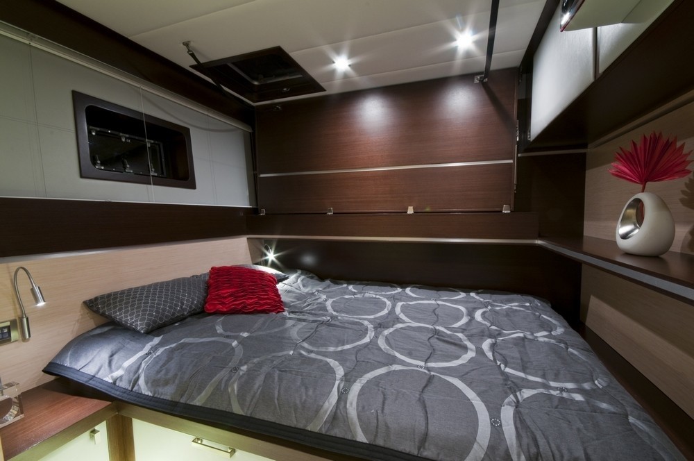 Her white and light colored walls and ceilings are accentuated with a mix of grey, black tones with bursts of red. There are plenty of spaces designed for dining, entertaining, and relaxing onboard the luxury catamaran MAS.