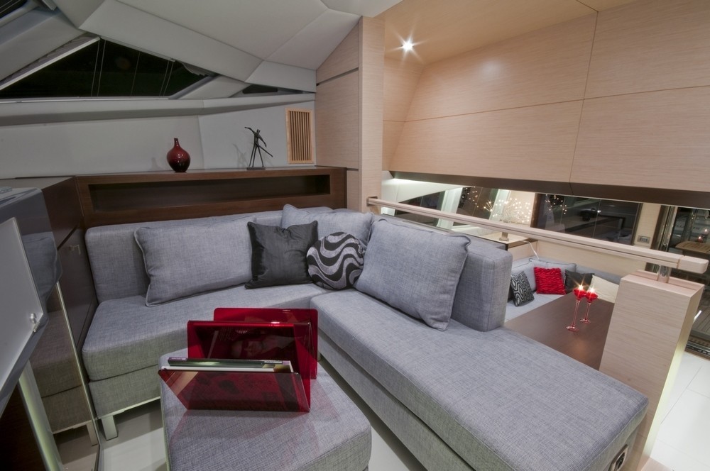 Her white and light colored walls and ceilings are accentuated with a mix of grey, black tones with bursts of red. There are plenty of spaces designed for dining, entertaining, and relaxing onboard the luxury catamaran MAS.