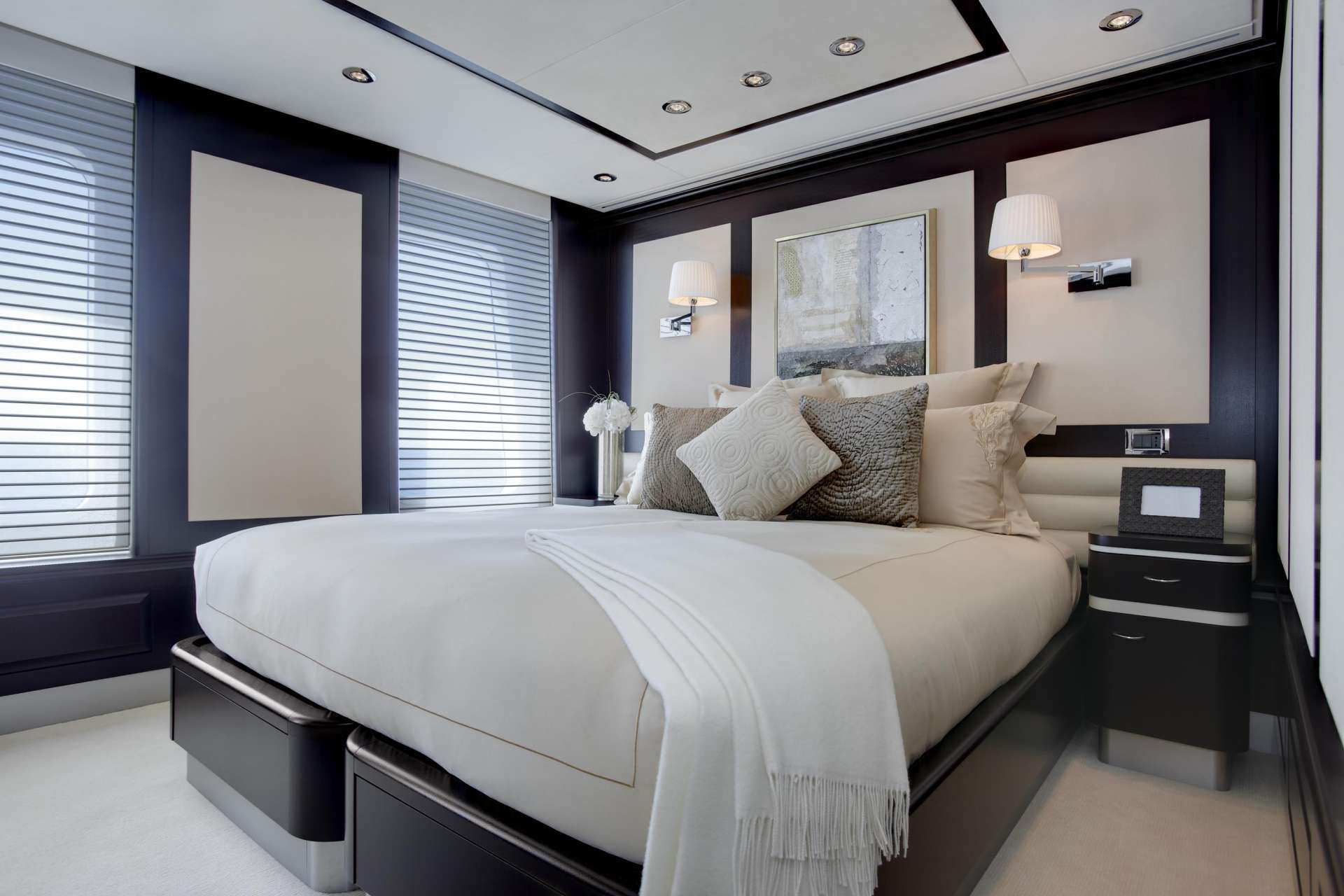 The accommodation on MEGAN consists of: Master Stateroom (double vaulted doors): Walk-around king bed, desk on starboard side, window seating on port side. Entertainment system with Large LCD high def flat screen TV/DVD. En-suite features large Spa Pool tub, twin sinks, vanity, dressing area, separate shower, and private head.