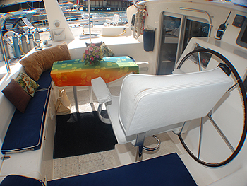 Her spacious cockpit offers plenty of room for dining alfresco under the stars, and her sun awning provides a cool haven for taking in the 360 degree view while enjoying a refreshing beverage.