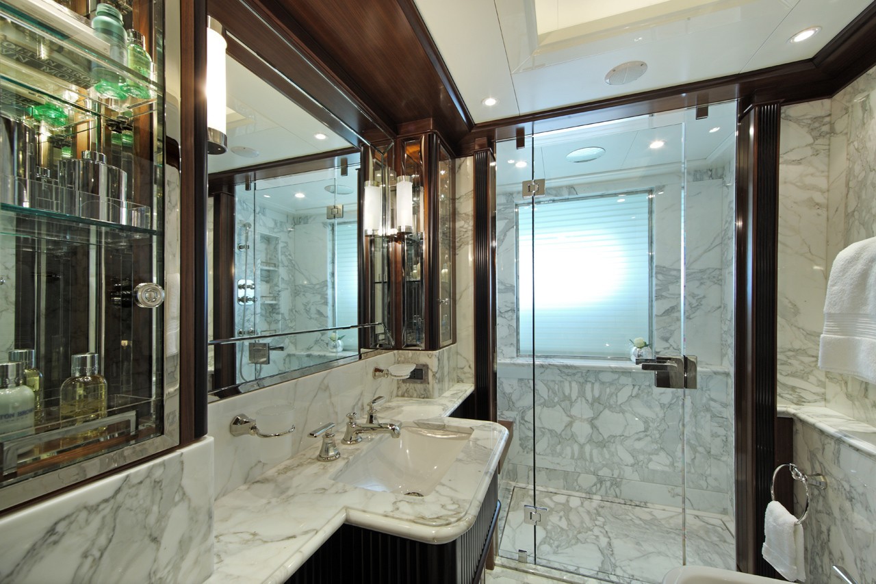 The VIP cabin with en suite shower room is located on the upper deck and the remaining cabins, including 3 double cabins, 2 with en suite bath and shower and 1 with en suite shower only and 2 twin cabins each with en suite shower rooms are located on the lower deck.