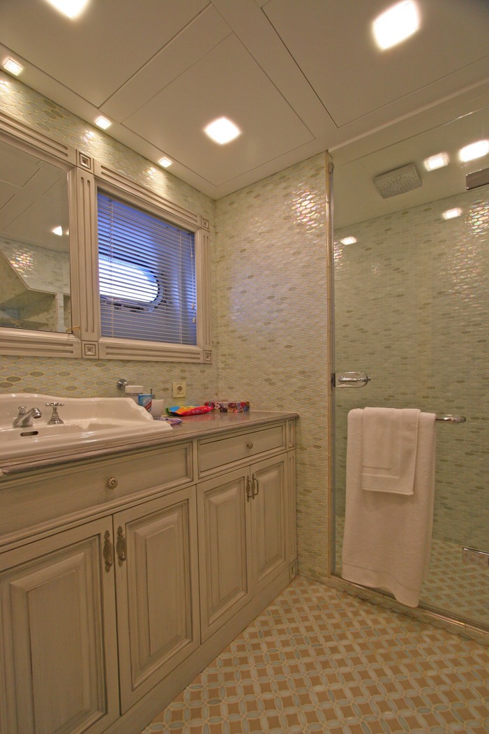She is able to accommodate up to 10 guests in five cabins including a large Master cabin on the main deck forward with a king size bed, study and sofa, a large aft Master cabin, with king size bed, study and sofa, a VIP cabin with Queen Size bed and study, a VIP cabin with Queen Size bed and a Guest cabin with two single beds.