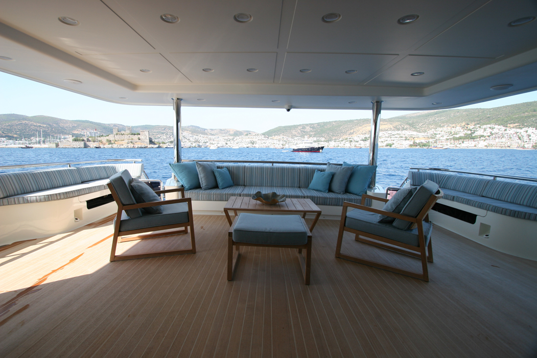 She is able to accommodate up to 10 guests in five cabins including a large Master cabin on the main deck forward with a king size bed, study and sofa, a large aft Master cabin, with king size bed, study and sofa, a VIP cabin with Queen Size bed and study, a VIP cabin with Queen Size bed and a Guest cabin with two single beds.