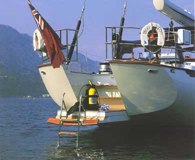Clear teak decks and opening transom steps offer a variety of on-deck possibilities, as well as comfortable boarding and swimming from a retracted platform. The interior successfully integrates social and entertainment features with the necessary practical aspects of ocean voyaging.