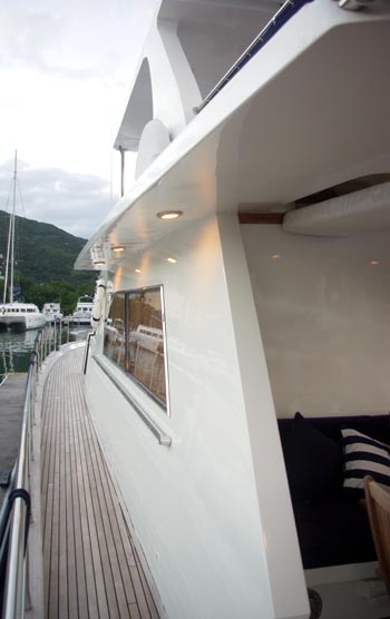 Her welcoming salon is beautifully upholstered in buttery leather, with finely varnished wood furniture and large windows for bringing the outdoors in. A gorgeous formal dining area seats 8 guests in comfort, the perfect place to enjoy specially prepared meals in cool comfort.