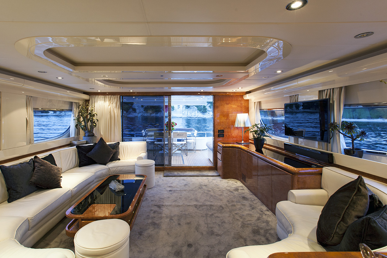 Her spacious salon is beautifully decorated with fine leather upholstery, plush carpeting and huge wraparound windows offering natural light and spectacular views. Enjoy a movie on her huge plasma television with DVD and stereo sound, or enjoy a sumptuous pre-dinner cocktail hour at the bar in her fully air conditioned comfort.