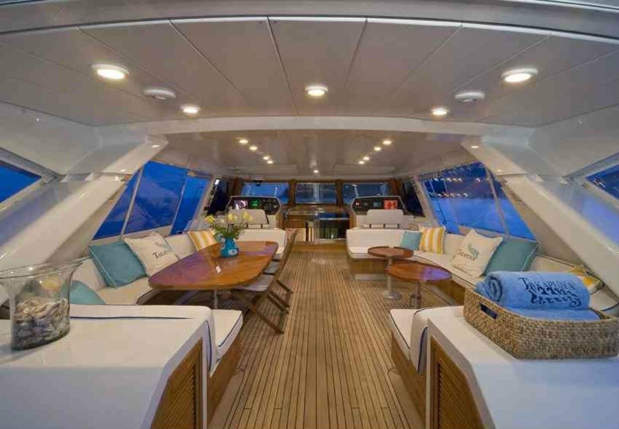 A custom skylight illuminates the main salon, which offers fully upholstered seating, 42” television with DirecTV and a 2000-movie library, and surround-sound stereo system with I-Pod hookups. A stunning dining salon offers ...