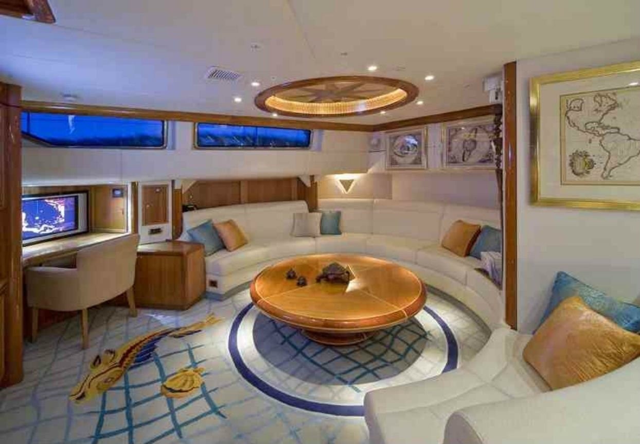 A custom skylight illuminates the main salon, which offers fully upholstered seating, 42” television with DirecTV and a 2000-movie library, and surround-sound stereo system with I-Pod hookups. A stunning dining salon offers ...
