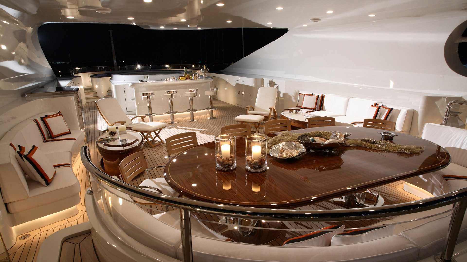 A particular feature is the additional top deck located above the sun deck. It forms a very private, panoramic deck, also served by the central elevator. There is a spa pool below, overlooked by the large raised dining area and marble topped wet bar.