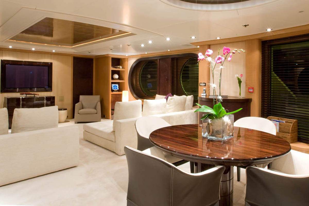 She offers a variety of options for dining: there are alfresco dining areas on the bridge deck and sundeck, as well as a large dining table in the main salon.