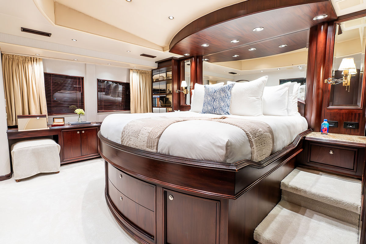 EALU boasts a desirable main deck master stateroom with walk-in closet plus four additional staterooms below deck including three queens and one twin; all with en suite facilities. The rich mahogany throughout is offset with soft, neutral tones that will appeal to everyone.