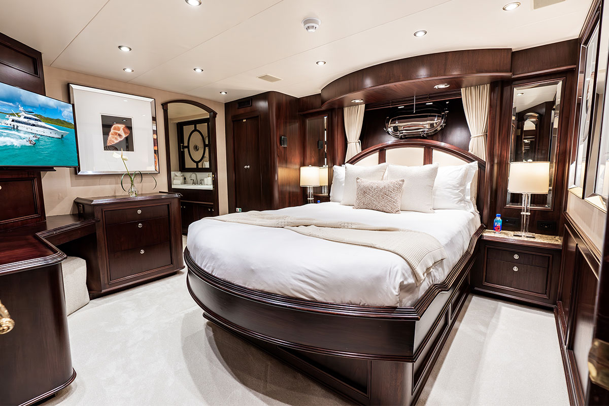 EALU boasts a desirable main deck master stateroom with walk-in closet plus four additional staterooms below deck including three queens and one twin; all with en suite facilities. The rich mahogany throughout is offset with soft, neutral tones that will appeal to everyone.