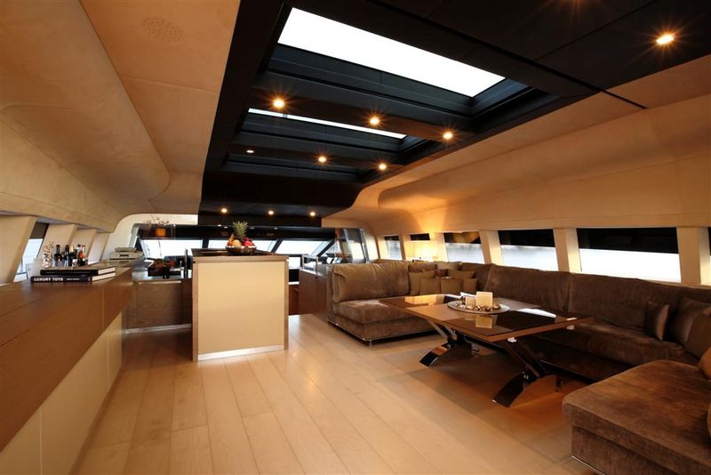 The upper salon also boasts a retractable sunroof. The yacht features extensive audiovisual equipment including Kaleidescope system throughout, LCD TVs in all saloons and cabins, Ipod stations and Sky boxes.