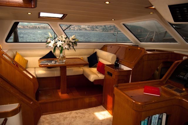 The Main Saloon is huge with a round table to starboard seating at least 8 guests, and a coffee table with occasional seating to port.