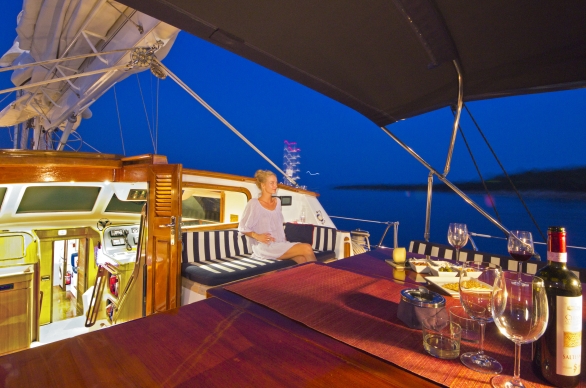 Her Pilot House has U shaped seating with all round visibility for either hot or cold weather. The Main Saloon is huge with a round table to starboard seating at least 8 guests, and a coffee table with occasional seating to port.