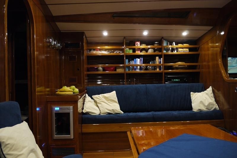 The salon and dining are an open plan with a generous U shaped formal dining space on the port side and settee to starboard. Indoor entertainment is provided by the state of the art audio and visual center.