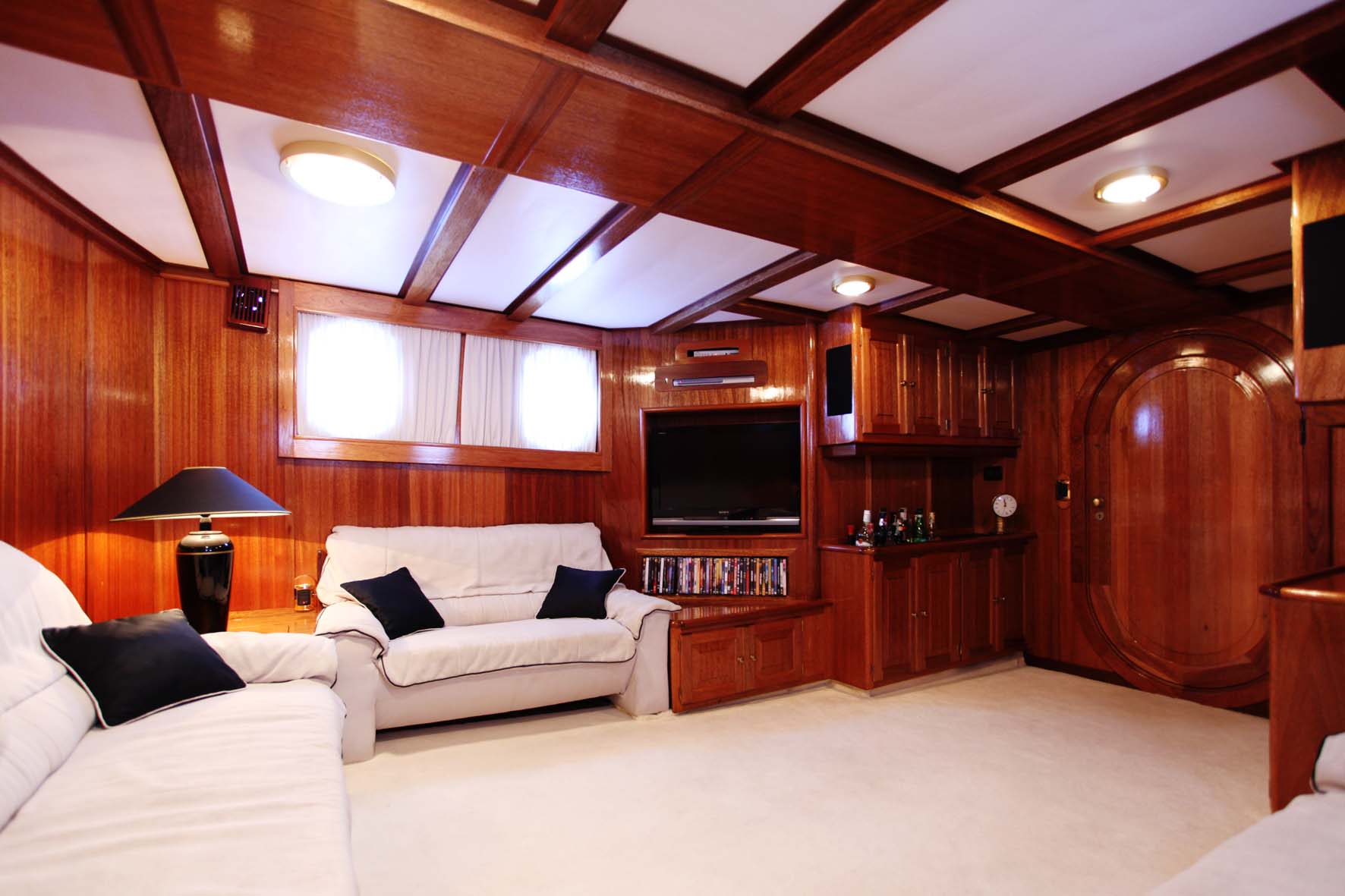 The main salon is laid out with comfortable cream sofas, and attractive wood furniture, and there is a separate dining room with bench style seating and chairs for formal dining.